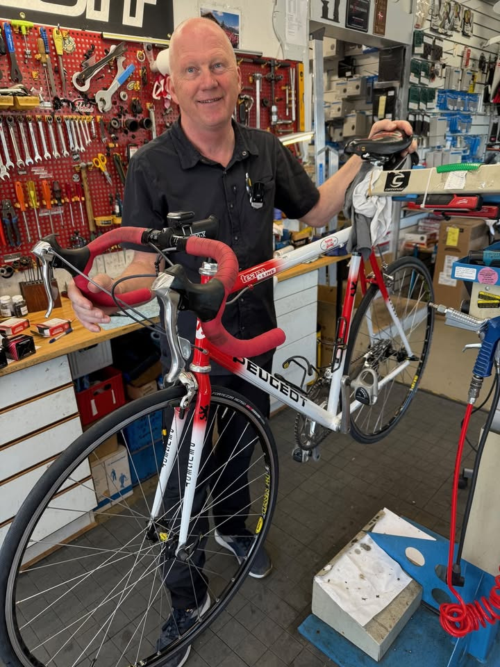 Fint besøg på værkstedet i dag 🤩 Original Peugeot "Home Jack & Jones" racercykel fra 1998 👏 Kun frempinden er skiftet og ikke den originale ITM fra dengang. Monteret med 7700 Dura ace 9-speed gearg...